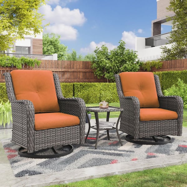 3-Piece Wicker Swivel Outdoor Rocking Chairs Patio Conversation Set with Orange Cushions