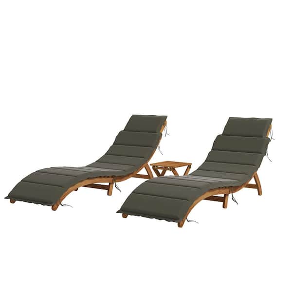 3-Piece Wood Foldable Outdoor Chaise Lounge with Gray Cushions and Table, Adjustable Reclining Position
