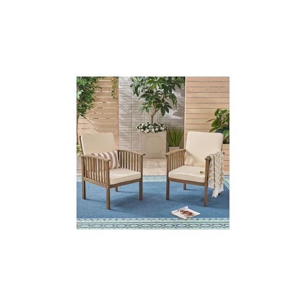 3 Pieces Acacia Wood Outdoor Furniture Patio Conversation Sets with Foldable End Table and Cream Cushion