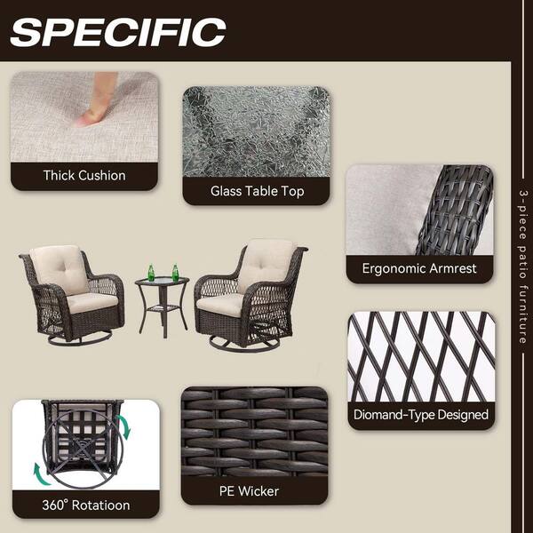3-Pieces Brown ‎Wicker Outdoor Patio Conversation Set, Rocking Chair, with Beige Cushion, and Side Table, for Backyard