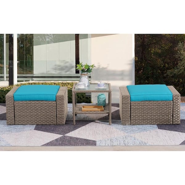 3-Pieces Brown Wicker Patio Conversation Set, Footstools and Ottomans Small Furniture, With Table and Gray Cushions