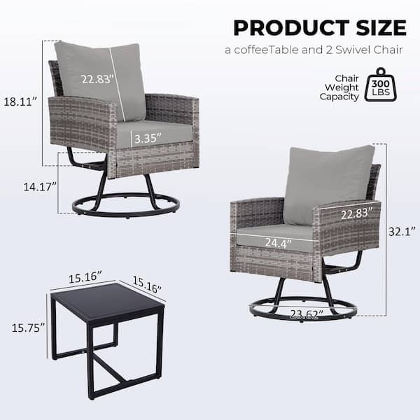 3 Pieces Gray Wicker Patio Conversation set with Medium Gray Cushions and Table, Swivel Chairs