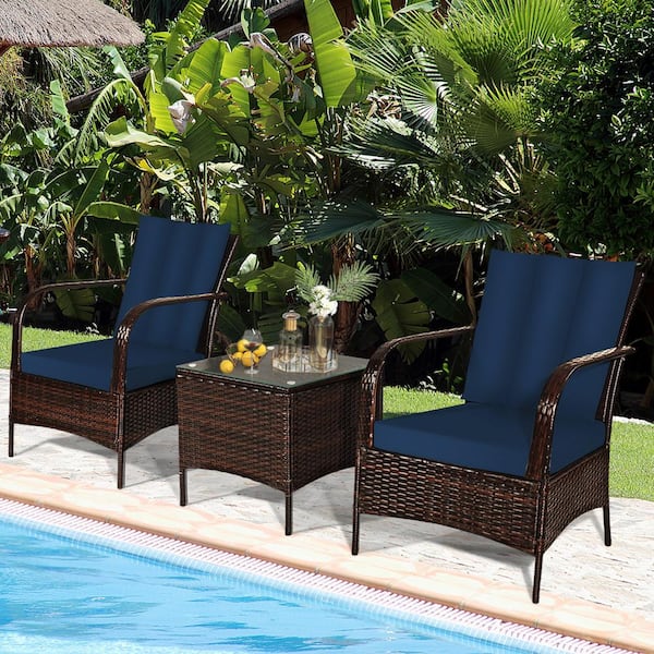 3-Pieces Rattan Patio Conversation Furniture Set with Glass Top Coffee Table and Navy Cushions