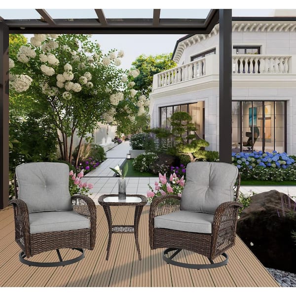 3 Pieces Wicker Outdoor Swivel Rocker Patio Chairs, 360 Degree Rocking Patio Conversation Set with Gray Cushion