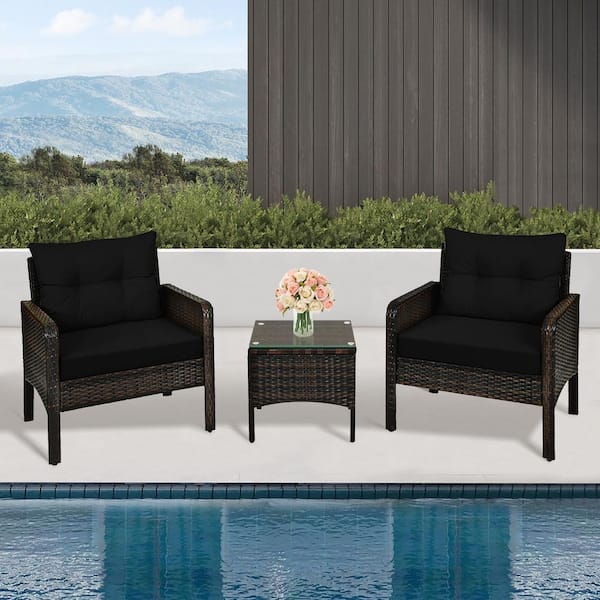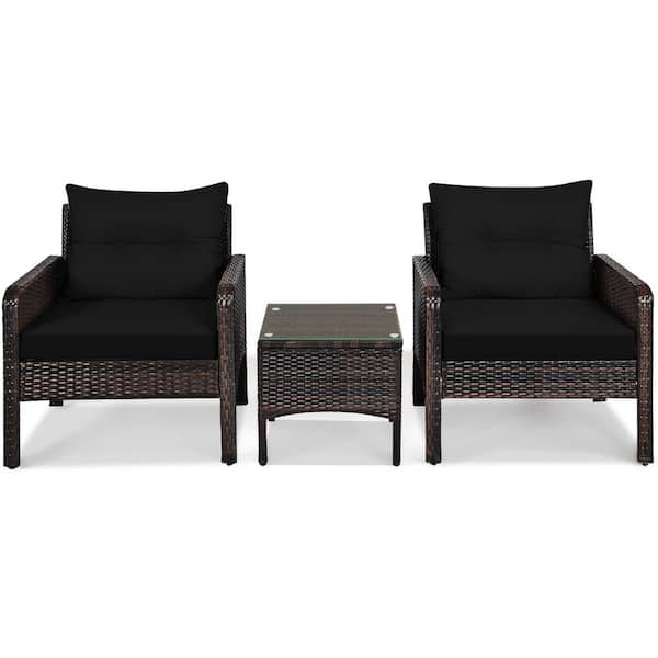 3-Pieces Wicker Patio Conversation Set with Black Cushions