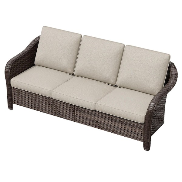 3-Seat Brown Wicker Outdoor Couch Patio Sofa with Thick Beige Cushions