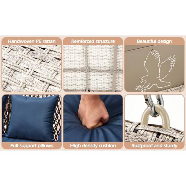 3-Seat White Wicker Hanging Patio Swing with Blue Cushions
