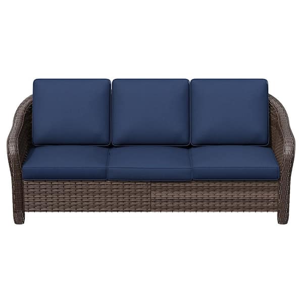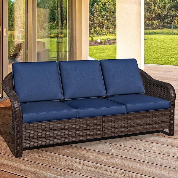 3-Seat Wicker Outdoor Couch Patio Sofa with Blue Cushion