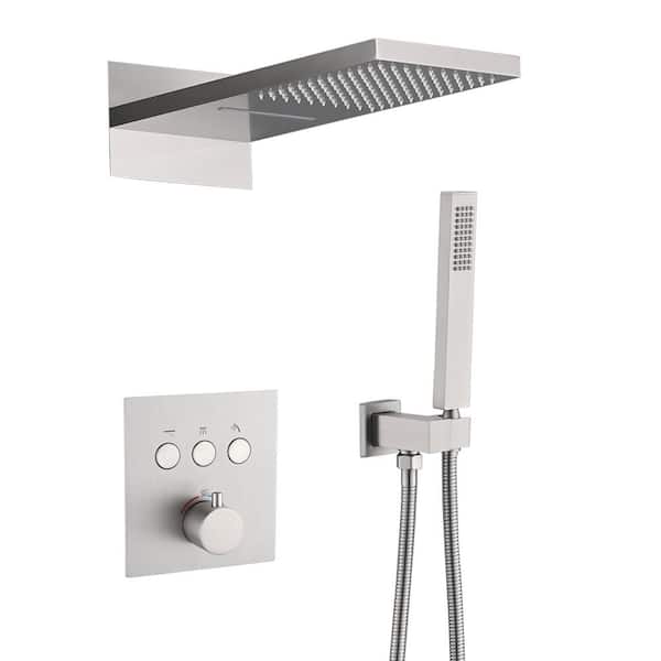 3-Spray 9.05 in. 2 GPM Wall Mount Dual Shower Heads with Handheld Thermostatic Bathroom Shower in Brushed Nickel