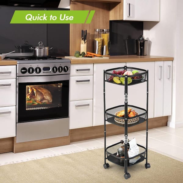 3 Tier Black Folding Metal Rolling Kitchen Cart Storage Rack Square Shape