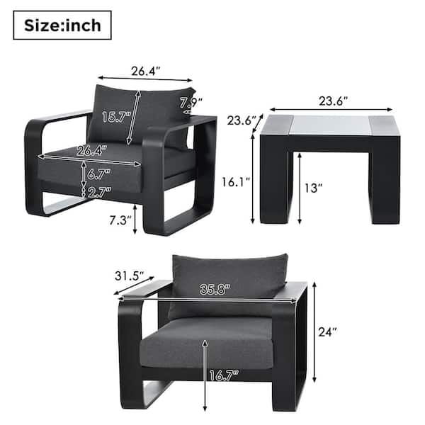 3 pieces Aluminum Frame Patio Furniture Conversation With Gray Thick Cushion And Coffee Table