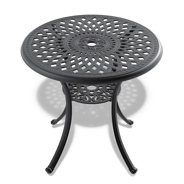 30.71 in. Round Cast Aluminum Outdoor Dining Table Patio Bistro Dining Table With Umbrella Hole in Black
