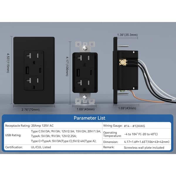 30-Watt Type A & Type C USB Duplex Wall Outlet for PD and QC, 20 Amp Receptacle, w/Wall Plate (1-Pack, Black)