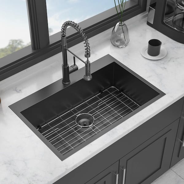 30 in. Drop-In Single Bowl 16-Gauge Gunmetal Black Stainless Steel Kitchen Sink with Bottom Grids