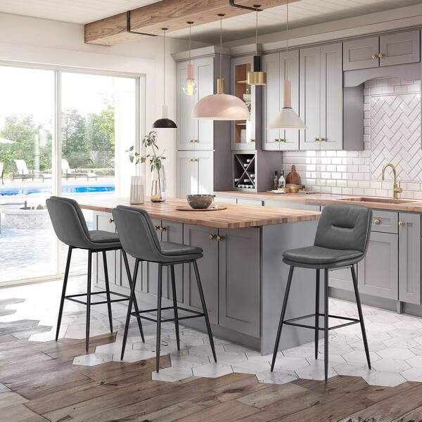 30 in. Gray Metal Frame Faux Leather Upholstered Bar Chairs Armless Bar Stools with Back and Footrest (Set of 3)