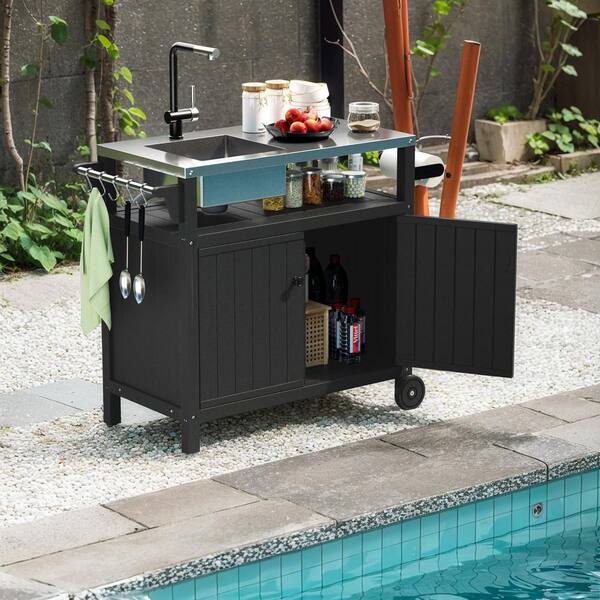 30 in. Outdoor HDPE Kitchen Island with Stainless Steel Sink, Metal Grill Cart Table with Storage Cabinet, Towel Rack