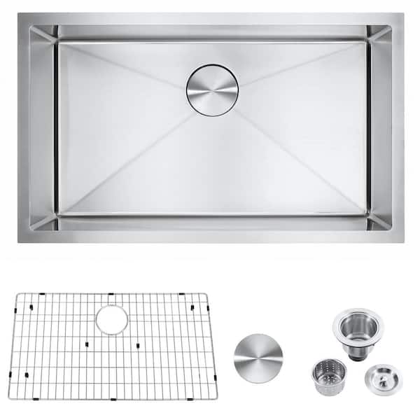 30 in. Undermount Single Bowl 18 Gauge Stainless Steel Kitchen Sink with Strainer and Bottom Grids