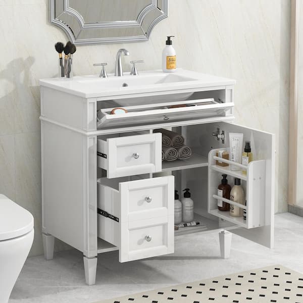 30 in. W Single Sink Bath Vanity in White with White Ceramic Top, Adjustable Shelf, Tip-Out Drawer