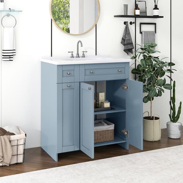 30 in. W Single Sink Freestanding Blue Bath Vanity with White Ceramic Top and Double-tier Deep Drawer Unassembled