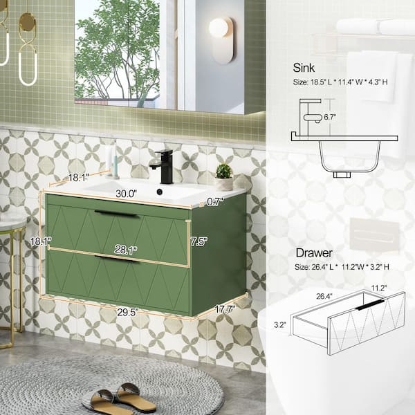 30 in. W x 18.1 in. D x 18.1 in. H Single Sink Floating Green Bath Vanity with White Resin Top and Drain Faucet Set