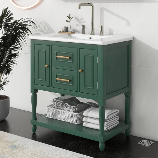 30 in. W x 18.3 in. D x 32.5 in. H Freestanding Bath Vanity in Green with White Ceramic Top with 2- Doors and 2-Drawers