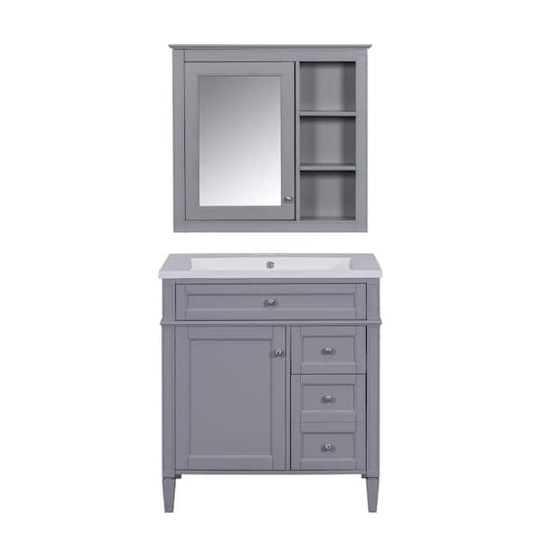 30 in. W x 18 in. D x 33 in. H Single Sink Freestanding Bath Vanity in Gray with White Ceramic Top and Mirror Cabinet