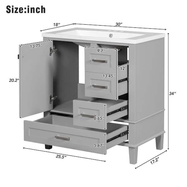 30 in. W x 18 in. D x 34 in. H Bath Vanity Cabinet without Top with a Soft Closing Door and 3 Drawers in Gray