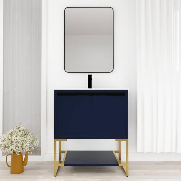 30 in. W x 18 in. D x 35 in. H Freestanding Bath Vanity with Shelf in Navy Blue with White Ceramic Top
