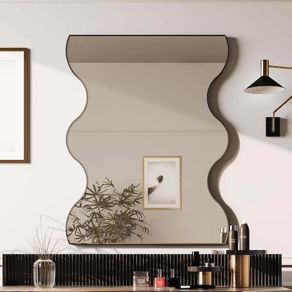 30 in. W x 35 in. H Rectangular Metal Framed Wall Bathroom Vanity Mirror with 2 Wavy Sides in Black for Bathroom