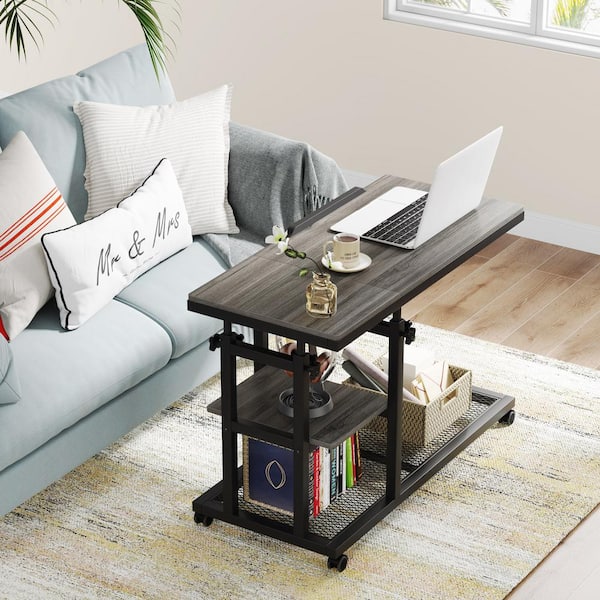 31.5 in. Mobile Gray Height Adjustable C-Shaped Table Particle Board End Table with Wheels and Storage Shelves