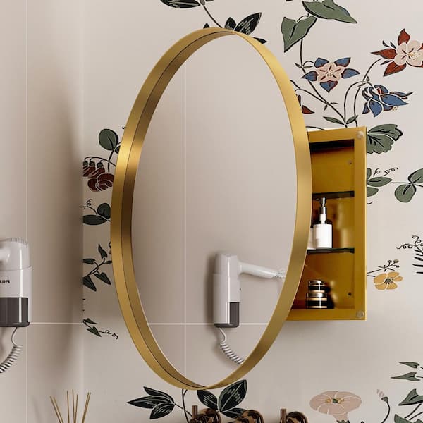 31.5 in. W x 31.5 in. H Surface Mount Gold Round Medicine Cabinet with Mirror and Adjustable Shelves for Bathroom