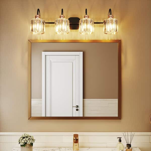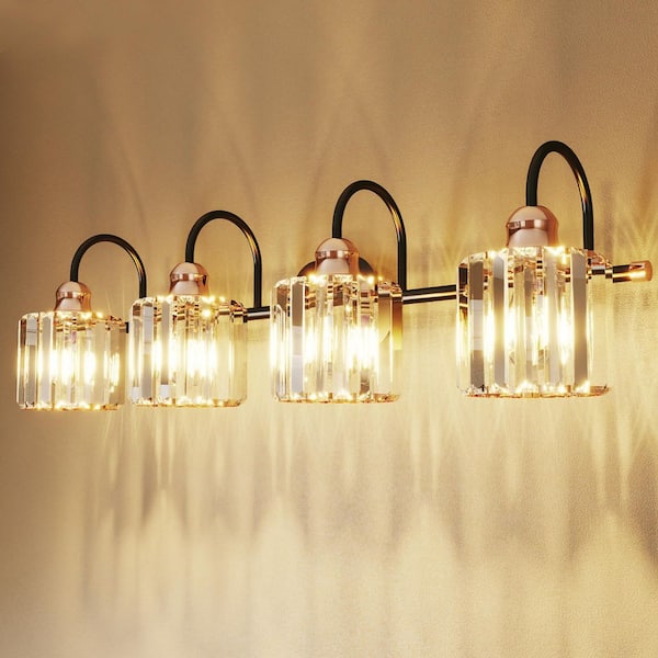 32 in. 4-Light Brass Black Vanity Lighting with Crystal Glass Shades