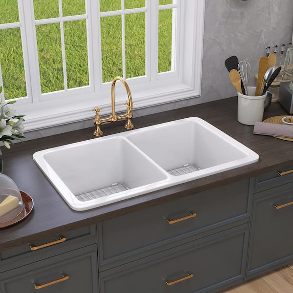 32 in. Drop-In/Undermount Double Bowl Farmhouse Fireclay Kitchen Sink Dual Mount with Bottom Grids and Strainer in White