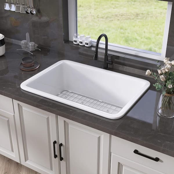32 in. Undermount Kitchen Sink Single Bowl Rectangular Sink White Fireclay Kitchen Sinks Drop-in Sink with Basin Rack