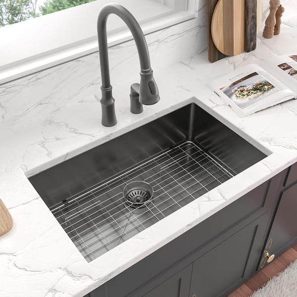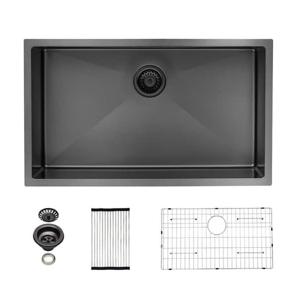 32 in. Undermount Single Bowl Gunmetal Black 16-Gauge Stainless Steel Round Corner Kitchen Sink with Bottom Grid
