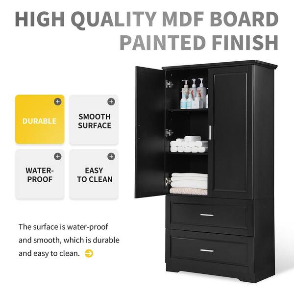32 in. W x 15 in. D x 63 in. H Black MDF Freestanding Linen Cabinet, Bathroom Cupboard w/ 2-Drawers and Adjustable Shelf