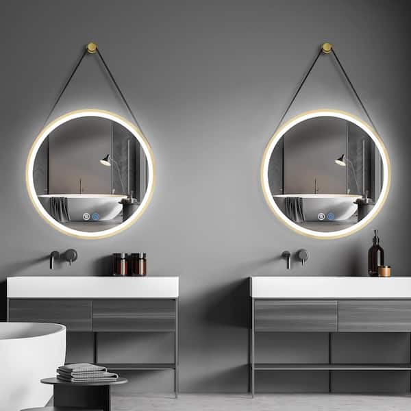 32 in. W x 32 in. H Round Large Framed 3-Color LED Light and Anti-Fog Deco Strip Wall Bathroom Vanity Mirror in Gold