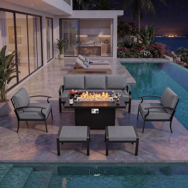 5-Piece Aluminum Outdoor Patio Conversation Set with armrest, 55000 BTU Propane Firepit Table and Gray Cushions