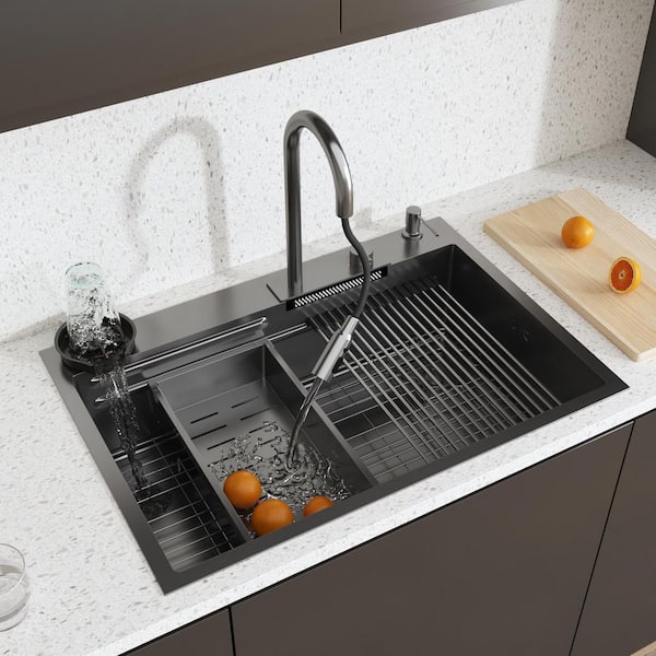 33.2 in. Drop-in Single Bowl Matte Black 304 Stainless Steel Kitchen Sink Flying Rain Waterfall Sink Set