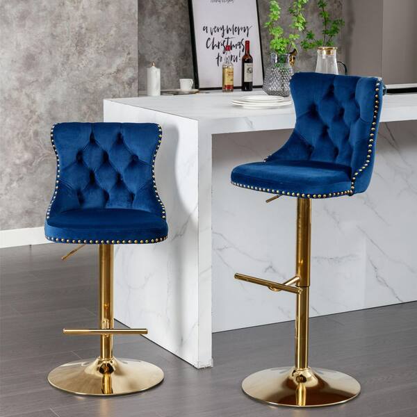 33 in. Blue High Back Metal Barstools with Swivel Velvet Adjustable Seat Height 2-Sets included