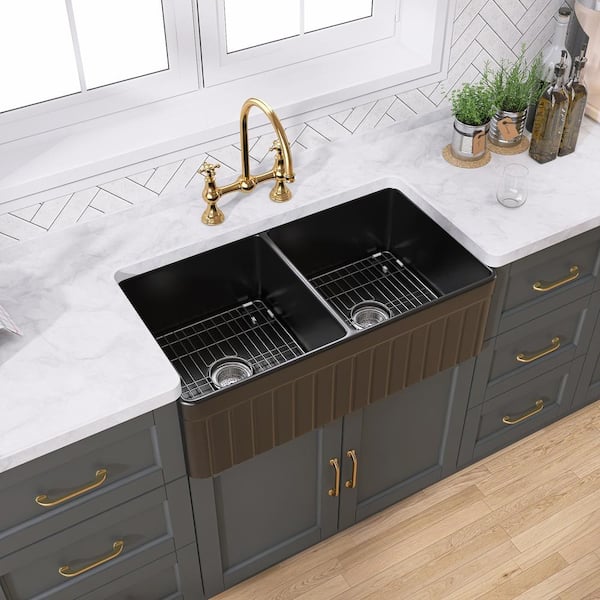 33 in. Rectangular Apron Front Farmhouse Kitchen Sink Double Bowl Black Fireclay Kitchen Sink with Bottom Grids Strainer