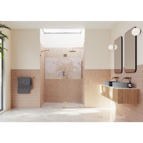 Halo 61.75 in. W x 78 in. H Glass Hinged Frameless Shower Door in Brushed Bronze with Clear Glass