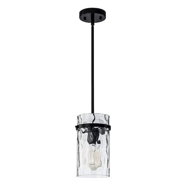 Modern Black Pendant Light with Handblown Rippled Glass Shade, Adjustable Hanging Light Fixture for Kitchen Island, Bar