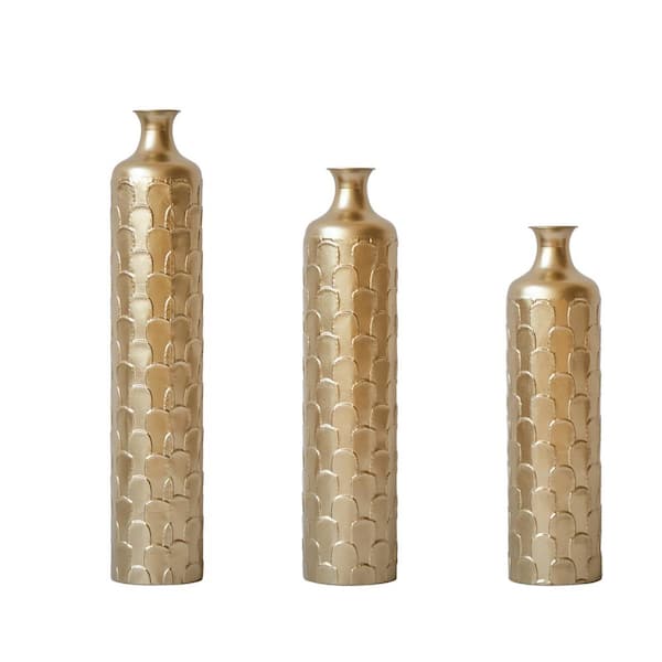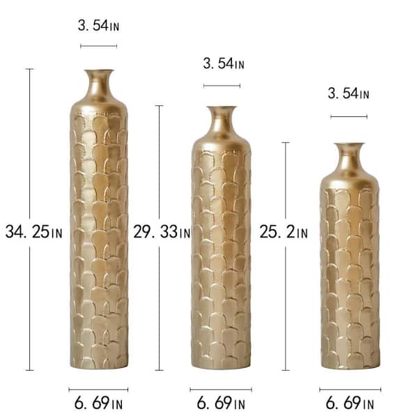 34 in. Gorgeous Gold Floor Large Glazed Metal Cylinder Decorated Vases Set of 3, for Living Room Dining Room Bedroom