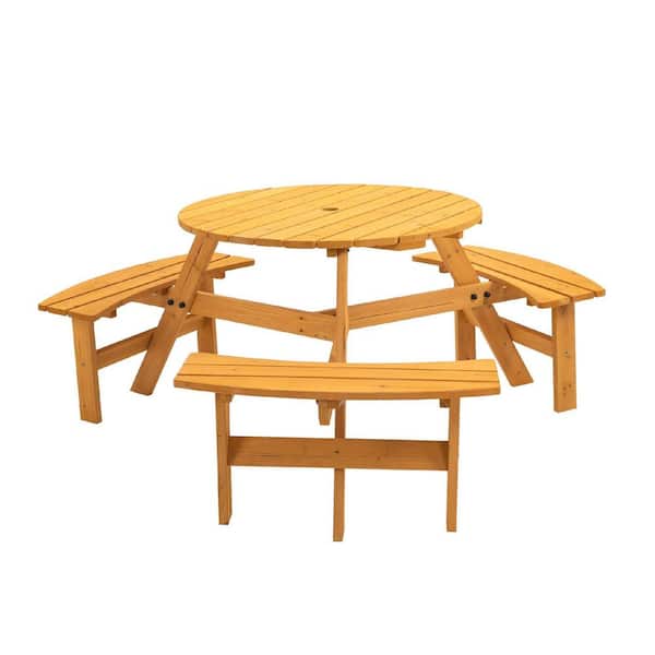 35.43 in. Natural Round Wood Picnic Table Seats 6-People with 3 Built-in Benches, 1720 lbs. Capacity and Umbrella Hole