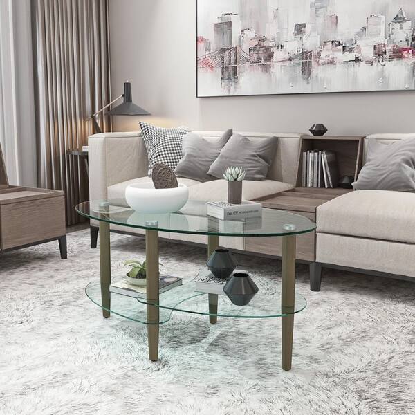35.44 in. Transparent Oval Glass Coffee Table with Oak Wood Legs and Foot Pads