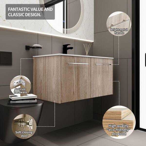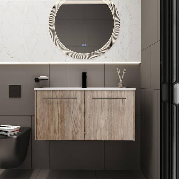 35.6 in. W x 18.1 in. D x 18.3 in. H Single Sink Wall Mount Bath Vanity in White Oak with White Resin Top