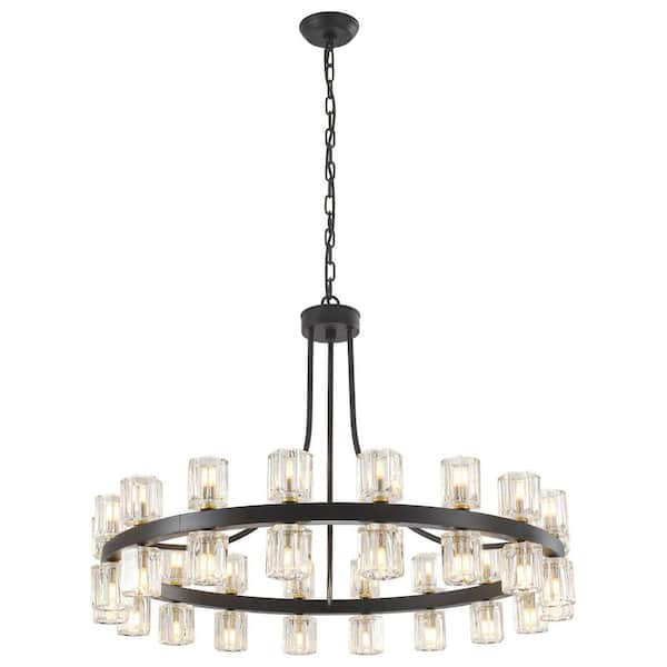 36.6 In. 36-Light Black Glass Crystal Modern Industrial Wagon Wheel Chandelier for Dining Living Room Foyer Staircase