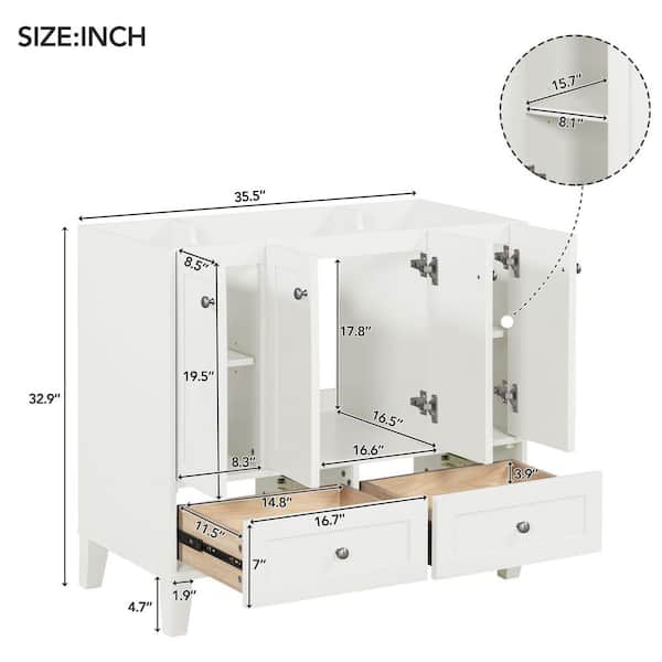 36 in. Freestanding Rectangular Bath Vanity Cabinet without Top in White with 4-Doors, 2-Drawers