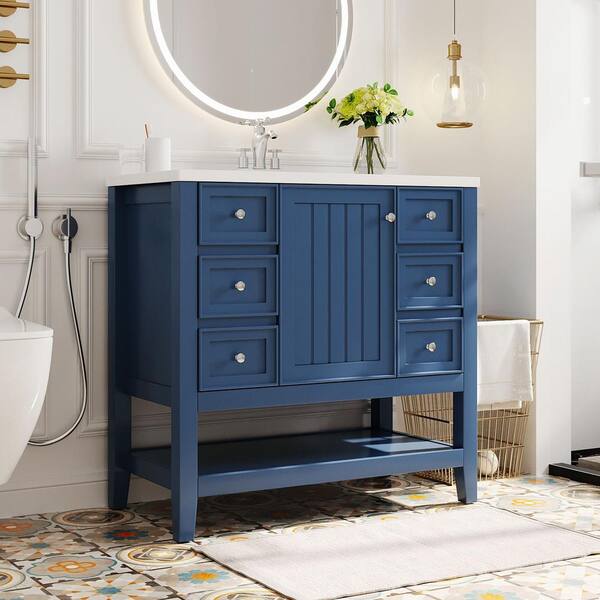 36 in. W x 18 in. D x 34.1 in. H Freestanding Single Sink Bath Vanity in Blue with White Ceramic Top and 3-Drawers